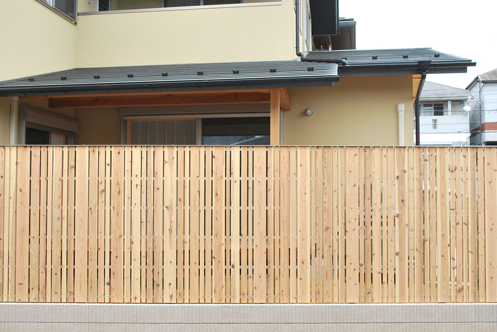 道路沿いのアウトドアリビングですが、ランダムな隙間のある杉板の縦格子塀により