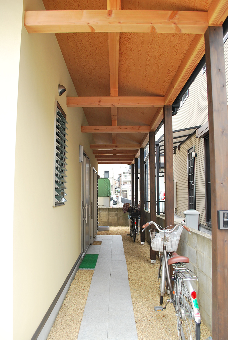 玄関前は路地のように長く通路をつくり、長い下屋根が伸びているので