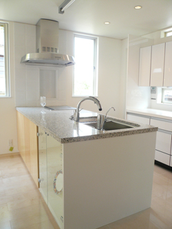 白御影石の天板のキッチンは幅と奥行き、機器にもこだわったオリジナルキッチンです。