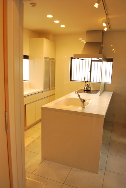 従来のL型キッチンをアイランド型を対面式に使用し、 それまでキッチンルームとして1部屋の利用であったのを、 リビングと合わせて2室使用として1階のメインルームを有効に使用できるプラン。