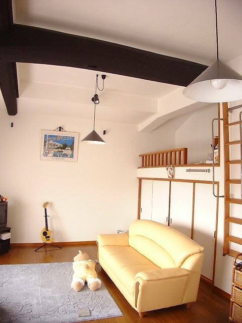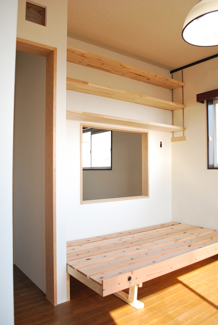 ベッドは折りたたみ式にして、 レイアウトの自由度を高めてある。 これから成長していく二人のお子様の為に楽しい空間を造った。
