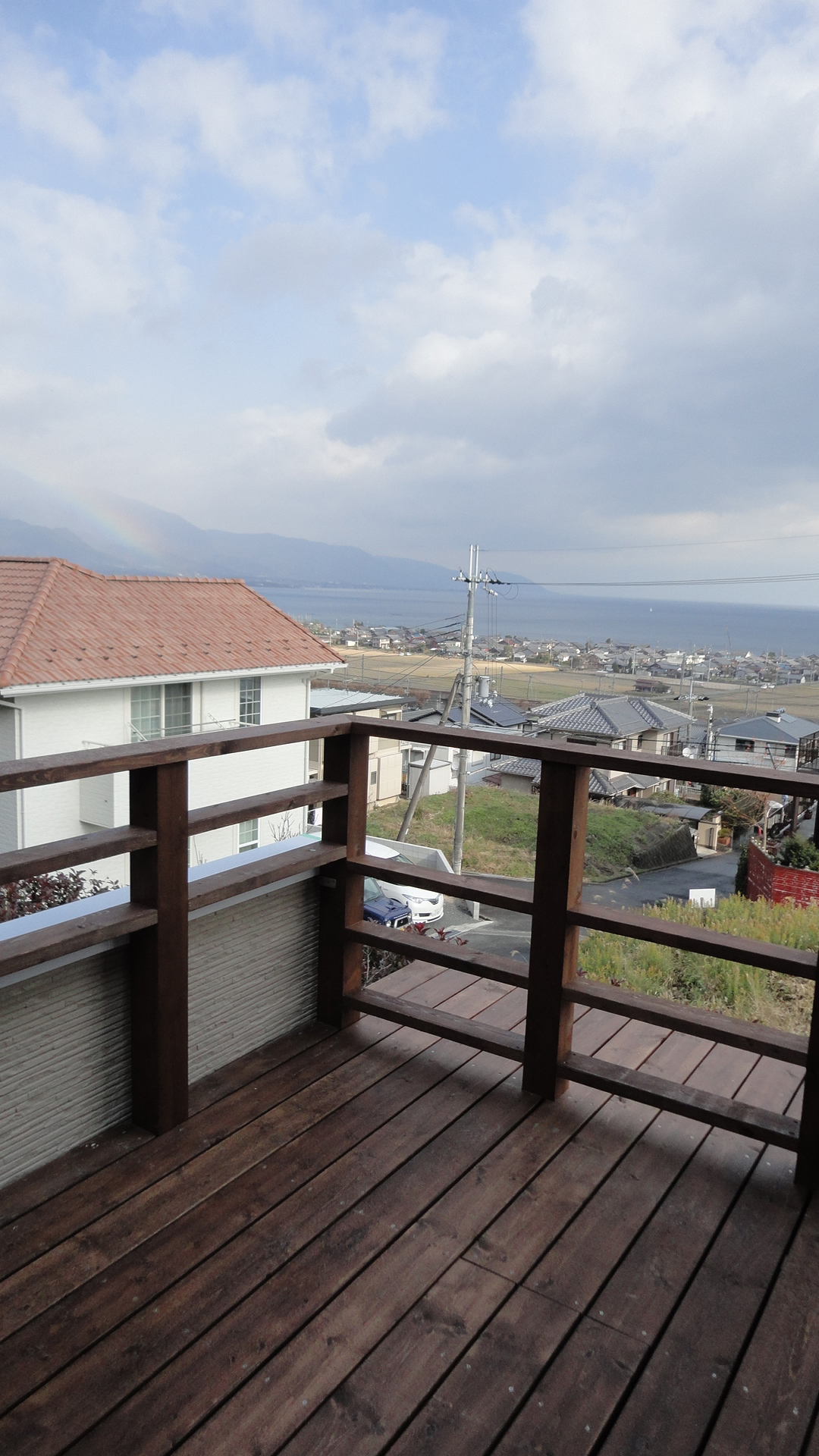 2階のリビングからバルコニーへ アプローチできるプランを同時に満たし、デザイン性と快適性を考慮し、周囲の景観の取り込みを重視し あえて鋼板の暖勾配の屋根の上にウッドデッキを造った。