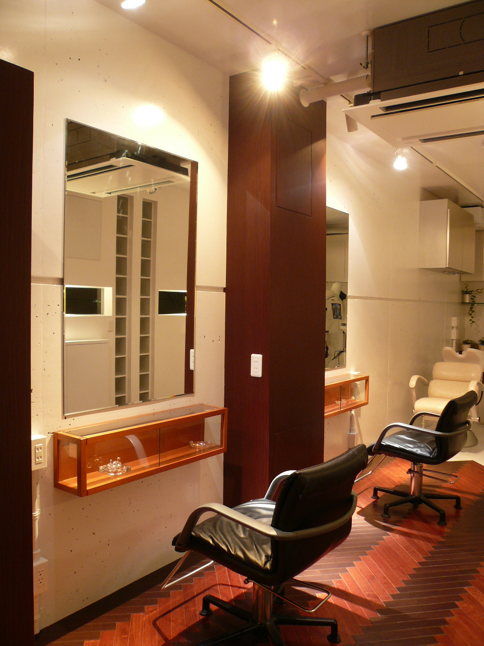 カットは2席とバックシャンプー1台。そしてVIPルームを店舗の奥に配置して、個室としてさらに落ち着くスペースをつくりました。
