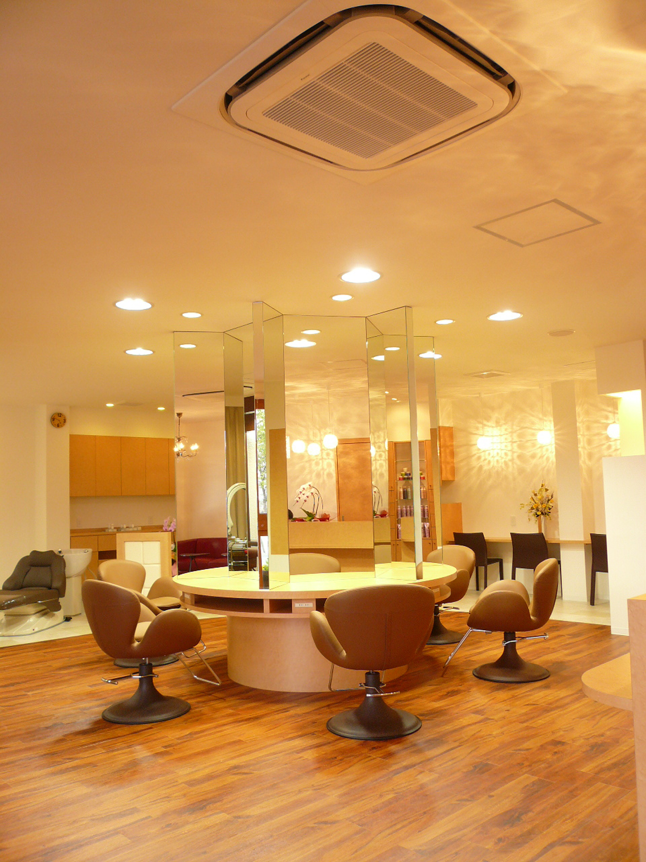 広いフロアスペースにカットブース・シャンプーブースなどそれぞれを孤立させながらも、スタイリストの動線を考慮しお客さまの心地良さを考え、余裕をもたせたレイアウトに。